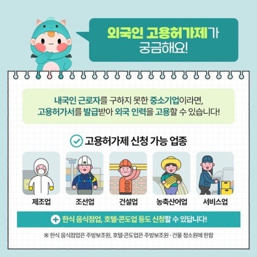 고용허가제는 한국정부(고용노동부)가 인력을 구하지 못한 한국기업에게 외국인근로자를 합법적으로 고용할 있도록 허가해 주는 제도입니다.