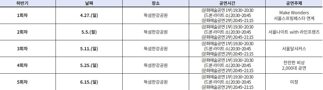 [2025 한강 불빛 공연] 드론 라이트 쇼 assa72 सन्देश 7 महिना पहिले पठित संख्या 563 Follow 2025 한강 불빛 공연(드론 라이트 쇼) □ 행사개요 ㅇ 행 사 명 : 2025 한강 불빛 공연(드론 라이트 쇼) 상반기 행사 ㅇ 일 시 : ’25. 4~5월 중 총 5회 ※ 예비일 6.22.(일) 편성 ㅇ 행사장소 : 뚝섬한강공원(수변무대) ㅇ 이용방법 : 현장 방문(무료 공연) ㅇ 행사내용 : 문화예술공연 및 드론 1,200대를 활용한 드론 라이트 쇼 개최 assa72 सन्देश Follow