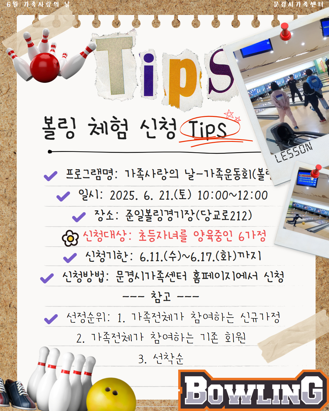 6월 가족사랑의 날 [볼링](경북 문경시) assa72 Message 6 months ago Views 641 Follow ★가족사랑의 날 다시 돌아온 '가족볼링!' ·진행기간: 25.6.21 (토) 10:00~12:00 ·대상: 초등자녀를 양육중인 6가정 ·장소: 준일볼링장 (당교로212) ·신청기간: 25.6. 11.(수) ~ 25.6.17.(화)★ assa72 Message Follow
